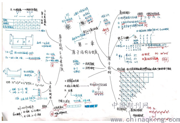 证据推理与模型认知是化学学科核心素养的思维核心,在自我复习和总结中引入思维导图,将知识模型化、可视化,有助于培养学生证据的推理和模型的认知的化学学科核心素养。只有认真总结和思考,才能绘制出满意的思维导图。而绘制的过程有助于培养学生思维的发散性、全面性、自主性和创造性。通过思维导图的绘制,将抽象、内在的知识进行可视化的表达,便于理解和记忆,实现了将书由厚度薄,抓住重点,提高复习效率。下图是复习结构化学第一章原子结构与性质时学生手绘思维导图。