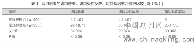 在切口感染率方面,优质护理组显著低于常规护理组(P<0.05);在切口炎症反应率方面,优质护理组显著低于常规护理组(P<0.05);在切口延迟愈合率方面,优质护理组显著低于常规护理组(P<0.05)。见表1。