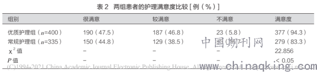 在护理满意度方面,优质护理组为94.3%(377/400),常规护理组为83.3%(279/335),前者高于后者(P<0.05)。见表2。