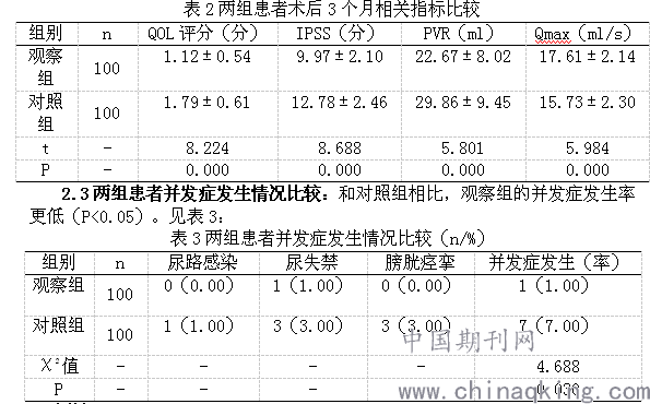 2.2两组患者术后3个月相关指标比较:和对照组相比,观察组的IPSS评分、QOL评分、PVR值更低,Qmax更高(P<0.05)。见表2: