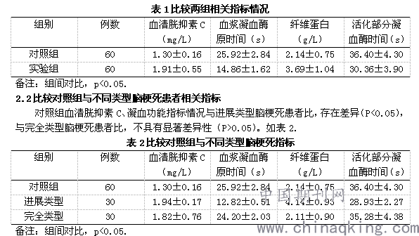 择取2019年2月至2020年9月期间,本院接收的60例急性脑梗死患者(实验组),并选择同期来我院进行体检结果为健康者60例(对照组),实验组患者年龄最大为81岁,最小为44岁,平均年龄为(62.50±3.98)岁,男患者25例,女患者35例,其中进展类型患者30例,完全类型30例;对照组健康者年龄最大为82岁,年龄最小为45岁,平均年龄为(63.50±4.01)岁,女性为38例,男性22例,对比基础信息显著差异性不存在(<0.05),具有可比性。