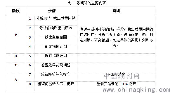 如表1所示,戴明环的“四阶段”指的即是P(计划)、D(执行)、C(检查)、D(处理)四个阶段,而“八步骤”则分散在每一阶段中。P(计划)阶段首先需要认真分析项目现状,找出目前的、或可能的质量问题,并分析产生问题的原因,从中找出主要原因和关键影响因素,继而制定出具有针对性的实施计划;D(执行)阶段要做的便是根据预定的计划一丝不苟的实施;C(检查)阶段需要对项目计划的执行情况进行不定期的检查,以确定计划是否有效实施,或在实施的过程中又出现了哪些新的问题;A(处理)阶段要审视项目计划执行的整体情况,对好的经验予以总结提炼并形成标准继承下来,对新出现的问题,或未解决的老问题要带入下一个新的PDCA循环予以解决。