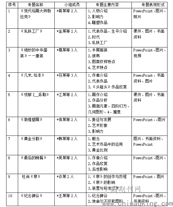 经过实践探索,可以确立美术欣赏单元的体验式学习的路径之一为:组成专题组员——确定专题——研究框架建立——专题组开展研究活动——全班交流和评价。