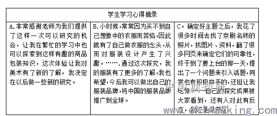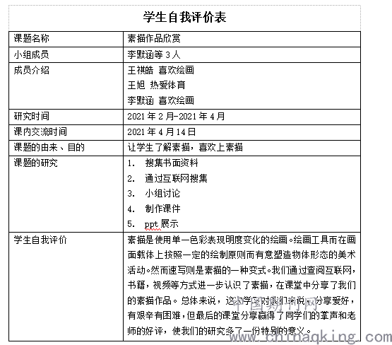 第三部分:课堂展示和课外交流。包括成果展示、小结、学生自我评价等,让学生在亲身实践中学习,体验和感悟,学生在展示中得到自我提升,在展示中获得自信,在自我评价中回归再思考。