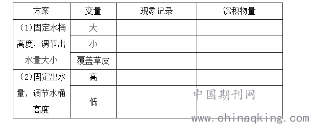 案例2:课堂模拟流水侵蚀和流水沉积地貌的地理过程。该实验材料容易获取,学生可招可操作性强,参与性强。材料准备:①带水龙头的纯净水桶,②带沙土的沙盘一只,③接水空沙盘一只,④人造草皮一块。