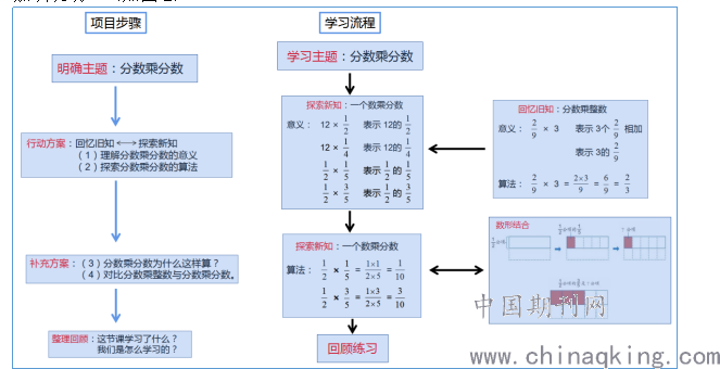 项目学习是一种深度学习,在这种学习情境中,学生作为调查员、研究员和知识的发现者去探索某个主题。项目学习能为学习者提供丰富的机会,让各种准备水平或不同学习情况的学生都能够深入学习。项目可以通过全班、小组、同伴合作或者个体的形式开展。数学课堂的项目学习,可以由师生、生生互动推进。以小学数学六年级上册《分数乘分数》一课为例,加以说明。(如图2)