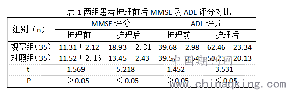 本研究结果显示,在实施护理前,观察组及对照组MMSE及ADL评分对比无统计学意义(P>0.05),在阿尔茨海默病患者积极配合的条件下,进行2个月的护理后,观察组MMSE及ADL评分均高于对照组,差异具有统计学意义(P<0.05),说明优质护理对比常规护理能够明显改善患者的认知功能及日常生活活动能力,延缓病情发展进程,提高患者的生活质量,因此值得在临床应用及推广。