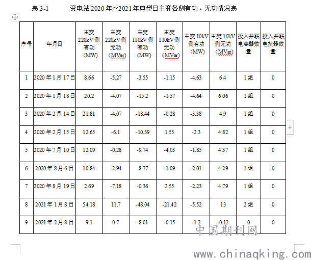 表3-1 变电站2020年~2021年典型日主变各侧有功、无功情况表
