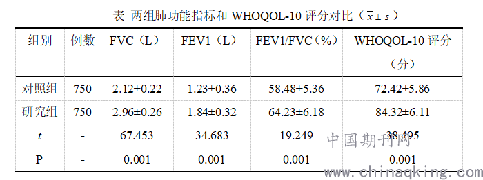 研究组肺功能指标优于对照组(P<0.05),WHOQOL-10评分高于对照组(P<0.05)。见下表: