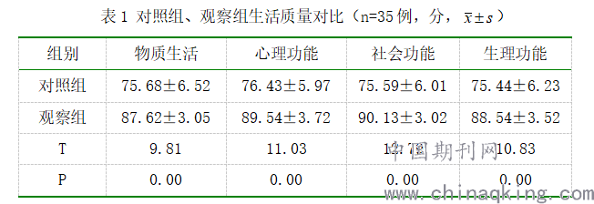 物质生活、心理功能、社会功能、生理功能评分方面,观察组高,P<0.05。详见表1.