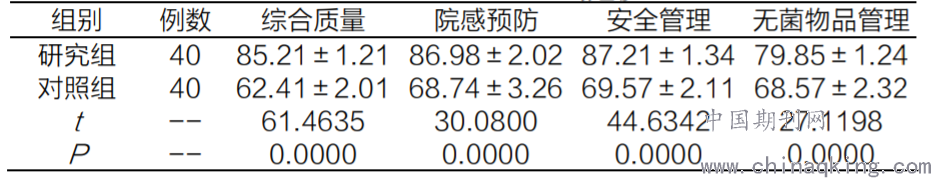 【摘要】 目的:此次研究的目的是对手术室护理中所存在的安全隐患进行综合性的分析,并且对预防措施进行有效的探究方法,此次研究选取我院2019年2月至2020年12月期间所收治的共计80位手术室患者进行综合性的分析及研究,并且通过随机切平均的方式对相应的80位患者进行分组,其中40位患者作为对照组应用常规性的手术护理模式,令40位患者作为研究组则应用安全干预的护理模式,进行综合性的护理,对两组患者的护理满意程度以及相应的护理质量进行分析。结果:在具体的分析过程中可以得知研究组患者所用。我的满意程度与对照度相比相对较高,并且整体护理质量相对较高,结论在具体的手术室护理过程当中,充分的对优质的安全护理干预模式进行有效的应用,能够使整体护理所拥有的高效性得以提升,并且使整体护理所拥有的质量能够得到进一步的优化。