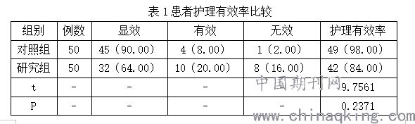 根据数据对比能够看出,使用护理干预干预护理的研究组患者诊疗有效率为98.00%,而常规护理形式的对照组患者护理有效率为84.00%,患者数据对比具有统计学意义P<0.05,能够判定护理干预干预护理效果较好。
