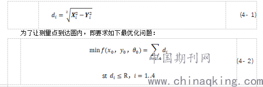 由于加工误差、定位器误差、传感器误差等,调姿结束后,物体位姿可能仍然无法满足要求。如图 7所示,四个圆点为调姿结束后四个测量点的位置,而虚线圆为定位要求位置(含公差),此时要将四个圆点放到四个圆内(圆心为),且其相对位置不能再发生变化。以下仅考虑平面情况。假设四个圆的圆心分别为,=1,.. ,4,由于物体在平面上只有三个自由度,取左下