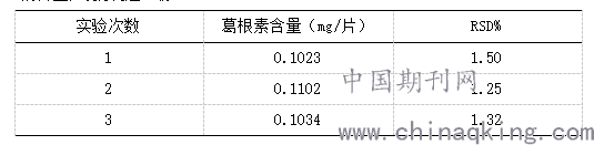 2.4 加样回收率试验:取同一批号的心可舒片5片,精确加入一定量的葛根素标准贮备液(0.8000g/L),按上述高效液相色谱法测定。