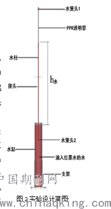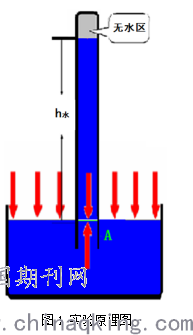 利用二力平衡的原理,对气体压强的测定转化为对液体压强的测定,测量介质用水,利用水缸里的水为传导压强的媒介,把大气压传到管内的水中,给其向上的支持力,以平衡管内的水柱压强,如图1,系统平衡以后,以水缸里水表面为参照面分析,薄层水面A受到上面液体压强和液体内部向上的压强,忽略水管上端无水区压强,则A面上水柱产生的压强等于大气压强。测出这个水柱高度和水的密度及当地的重力加速度,利用求出大气压强。