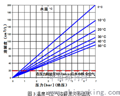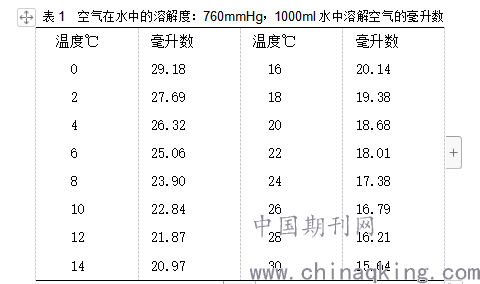 由图3知[7],在温度一定时,大气压强与空气在水中饱和溶解度成正比,表1[7] 列出了在一个标准大气压下水的饱和溶解度,由此可以算出当地大气压下(温度相同)水的饱和溶解度:,是在标准大气压下的饱和溶解度,是在大气压下的饱和溶解度。