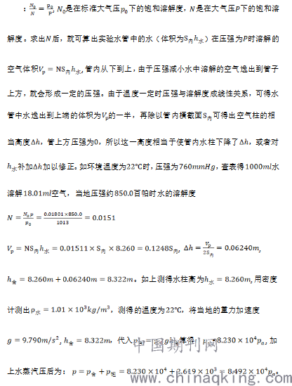 用水做大气压强测量实验产生的误差主要来自水中溶解的空气及管子上端的水蒸汽。虽然空气大部分可以通过二次的注水方法进行排除,但是二次注水后再次溢出的空气则无法排除,它在一定程度上还会影响实验结果。对于管上端的水蒸汽也不容忽视,它也是造成实验结果无法达到理论高度的主要原因之一。所以一般的情况下,测出的大气压比实际值小,所以实验结果必须修正。方法如下: