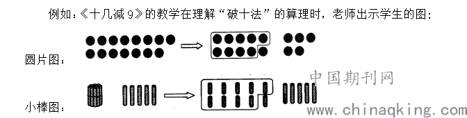 (1)问:你能看懂他们的摆法吗?试着像他们这样摆一摆。生边摆边给同桌说怎么减9:15根小棒有1捆和5根,从5根去掉9根不够,就拆开1捆减9根还剩1根,再和5根合起来是6根。(2)结合摆的过程说说计算15-9先算什么,再算什么?用式子把计算过程写下来(10-9=1,1+5=6)。(3)对照图理解计算过程中的10是哪里来的?为什么要加5?像这样在摆中说、画中说、算式与图对照,将动手操作、画图、数学语言及算式充分地联系起来,从而将多种表征方式结合起来,在充分理解算理的过程中让思维清晰、有逻辑性,将操作表象转换为图画,将图画转换为语言表达,将语言表达转换为简洁的算式,让学生的思维从形象→半抽象→抽象一步步提升。