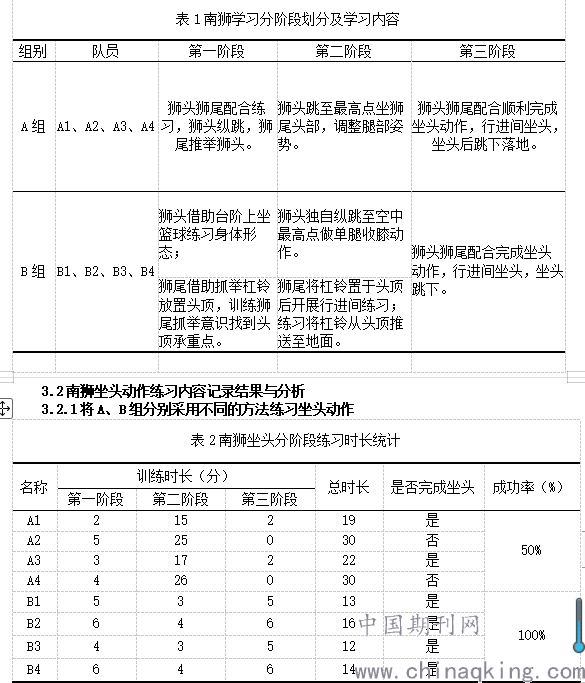 2.3实验法 将参与舞狮学习的学生分成两个组别,即A组和B组。分别采用两种不同的方法对学生开展教学,观察学生学习的变化。