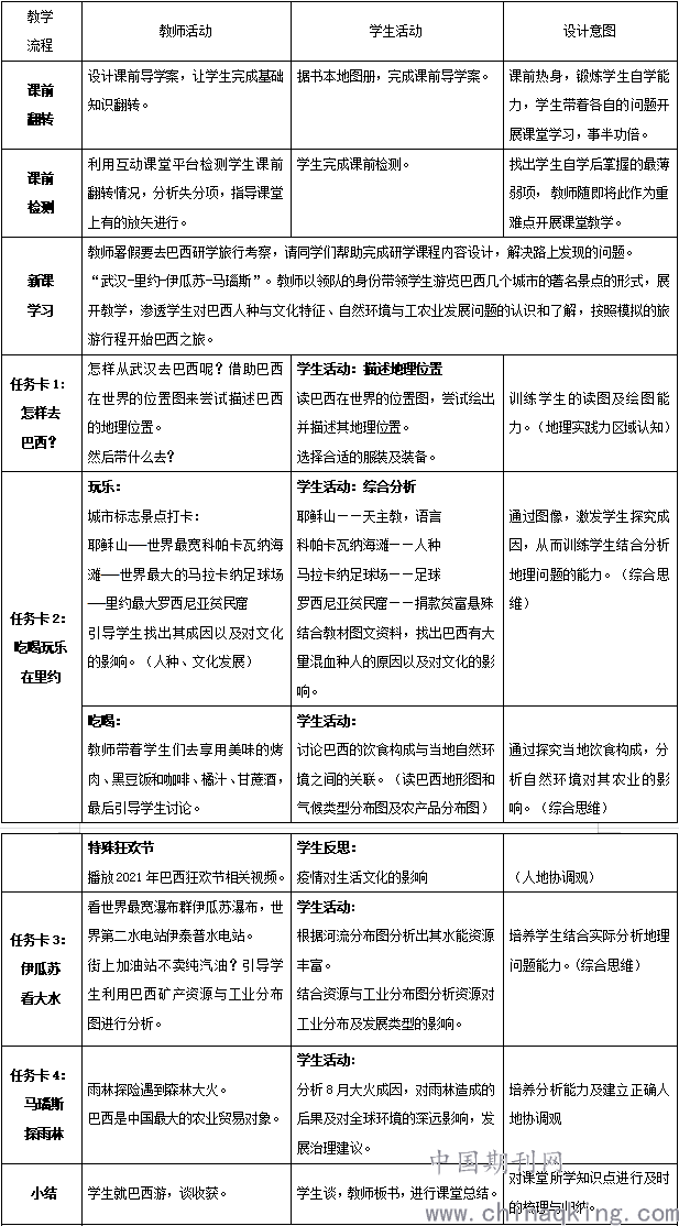 七年级学生,学生对知识的积累停留在区域认知阶段,综合思维没有得到充分的锻炼,因而这节课巴西设计目标为,通过情境探究形式,调动学生综合思维,通过运用已知知识解决问题,逐步击破难点,使学生掌握区域地理学习方法,构建区域地理学习模式,并会举一反三迁移运用,使学生的地理核心素养得到提升。