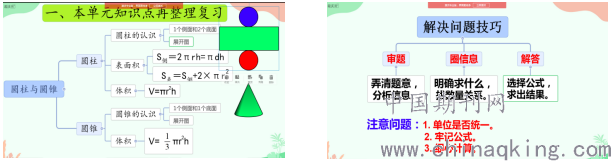 例如,在教学《圆柱与圆锥的整理复习》一课时,我在课前大量收集学生在练习时出现的易错易混知识点——关于圆柱面积计算及圆锥体积计算的相关知识。课中我先以大数据呈现学生易错易混题型的百分率,同时结合实际错题进行即讲评即订正的教学,同时又一边以思维导图的形式呈现了相关的易错易混知识点所需的计算公式,以及相关知识的解题技巧。如下图: