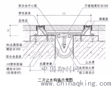 为防止地表水沿伸缩缝进一步渗入建构筑物内部,这里提出了一种改进措施,如图所示,在原有止水措施的基础上进行二次止水构造,具体做法为沿伸缩缝两侧各凿除150*60mm浅槽,沿浅槽面铺贴橡胶防水卷材,在伸缩缝内做出U形弯;用金属胀锚螺栓螺栓固定铝合金压型件,活动铝合金压型件与固定铝合金压型件之间通过弹性胶条密封,面层铺贴后面层材料与压型件之间缝隙用填缝胶密封。