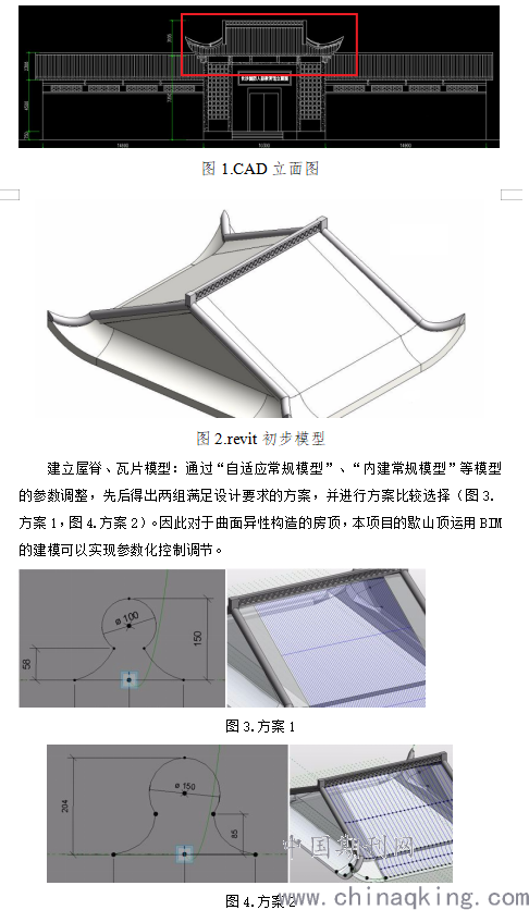 某仿古建筑房屋屋顶为歇山顶,属于曲面异形构造。所以以往的的二维制图软件不能展示设计、施工的要求,而通过BIM的相关软件可以对其进行建模,并添加参数进行模型控制。