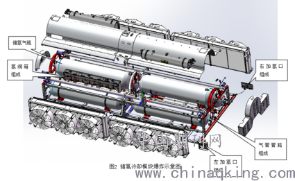 氢动力系统主要包括氢燃料电池、储氢模块、冷却模块、DC-DC 装置、牵引蓄电池等。为车辆提供持续安全稳定的动力来源。目前选用的氢燃料电池是加拿大Ballard公司提供的质子交换膜燃料电池模块,其理论使用寿命大约为12000小时。氢动力各个系统均与能量管理控制器进行实时信息交互,受整车能量控制器进行控制,根据不同工况,实现统一协调工作,为整车提供电能。