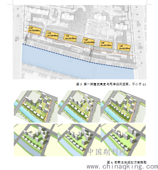 处理与南侧电厂河界面关系时,第一排建筑采用了点式建筑形式,并且控制建筑高度不超过50m(图1),满足南侧沿河景观通透性要求。在分析了电厂河景观视角之后,为保证45°视线不被遮挡(图2),第一排建筑高度与同岸沿河距离,不小于1:1(图3)。滨水首排建筑呈高低错落式布局,以增加建筑空间的层次感。