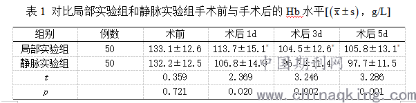 局部实验术和静脉实验组手术前Hb水平对比差异不明显(P>0.05),手术后的1d,3d,5d时两组的Hb水平对比,明显局部实验组要高于静脉实验组(P<0.05),如下表1所示。