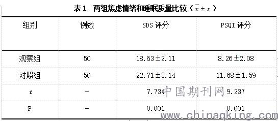 两组患者SDS以及PSQI评分比较分析, 观察组患者分值都低于对照组患者,差异有统计学意义 ( P < 0.05) 。见表 1