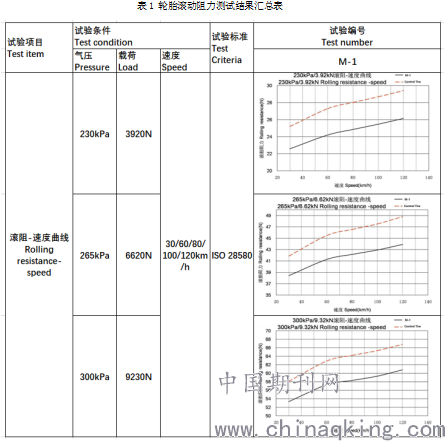 通过以上七个方面出发,不仅可以完成降低轮胎滚阻的目标,对于轮胎的抓地力、操纵稳定性及舒适性性能均有所提升,其中其中①②④对轮胎滚阻的影响约为85%~90%,③⑤⑥⑦对轮胎滚阻的影响约为10%~15%,本课题主要考虑①②④方面对轮胎滚阻的影响,并进行实际验证,如下是优化①②④后方案M-1与原车Contrel Tire轮胎滚阻测试结果对比分析: