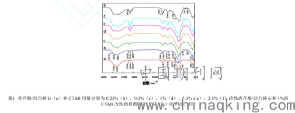 由图1a可见,体系未加入CTAB淀粉材料的FTIR谱图中出现淀粉的特征吸收峰和有机小分子基团—CH2和—CH3的2920和2854cm-1吸收峰。随着CTAB用量增加,淀粉材料中—CH2和—CH3的2932和2858cm-1吸收峰增强(图2b~f),1464和1423cm-1处来自淀粉C=C伸缩振动峰增强,说明淀粉表面的淀粉分子结构中C=C双键与CTAB之间存在一定的相互作用。1640cm-1为淀粉的特征吸收峰,形成复合材料后位移至1626cm-1,表明淀粉水存在交换作用。与CTAB未改性淀粉材料相比,在3544和3430cm-1处吸收峰位移至3560和3404cm-1,表明已对香淀粉材料成功改性。