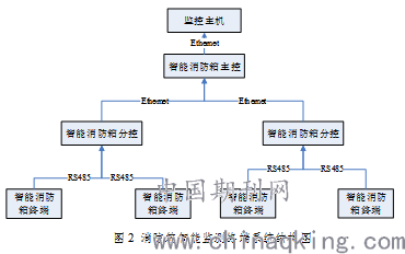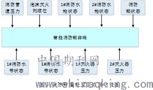 其中的消防箱智能监测终端系统结构图如图2所示,用于将消防箱内各设施的实时状态进行采集,智能消防箱终端功能图如图3所示,终端采集箱体内消防栓的压力信号、泡沫灭火剂的液位信号、灭火器的压力信号、消防窗的开关信号、消防水枪的脱落信号、消防水带的脱落信号、灭火器存在信号等数据,并通过RS485串行通讯线上传给相应分控,分控把从终端采集的相关数据进行处理后上传给主控,同时分控具备所辖终端历史数据的存储功能,主控对数据进行处理后通过网络上传给监控主机,同时主控具备对其所辖终端历史数据的存储功能,实现对普通消防箱内设施的实时监测功能。