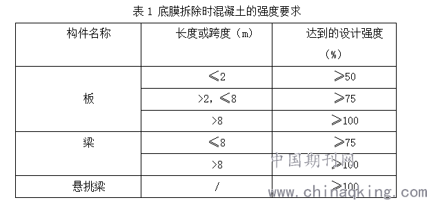 第二,拆模时间要参照设计图纸的要求,确保硂达到一定强度(见下表1)。按施工方案拆模,先拆后支,后拆支架。先拆非承重部位,再拆承重部位。拆除梁模板时,先侧向,后竖向。拆模操作要采取保护措施,不能用撬棍蛮力撬动,避免混凝土表面受损。高空拆模时,在出入口设置围栏或警示牌,非作业人员禁止入场。拆掉的模板不能放在现场,垂直运输模板时,要统一调度和指挥。模板表面要干净,边角涂抹封边漆,封堵螺栓孔。模板清洁时,应高出地面150mm,防止下雨受潮。混凝土浇筑结束,且强度达标后,为了能够循环使用模板,需要尽快拆除支撑模板。