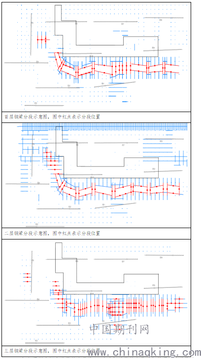 本工程存在大量的大跨度钢梁,主要分布在C区的二层及三层,其中三层数量最多;同时B区也存在部分大跨度钢梁,钢梁最大跨度达33m。大跨度钢梁跨度大、截面大,重量大,项目部在深化设计阶段与设计沟通了钢梁的预起拱,在制作阶段按现场吊装分段要求进行了加工。我项目部考虑到施工工期紧、穿插施工多,故采用搭设满堂脚手架做混凝土劲性梁的支撑,先铺设梁底模和底筋后安装钢梁,再绑扎面筋及箍筋,最后封梁侧模。分段钢梁安装过程中,在其底部设置钢垫块和楔块进行支持和标高调节。