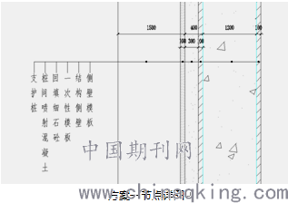 1)方案一:按常规设计方案为双侧支模,支护桩与结构侧墙之间的间距为0.4m,桩间喷射混凝土厚度0.1m,防水层及一次性模板厚度约0.1m,剩余0.3m回填细石混凝土。