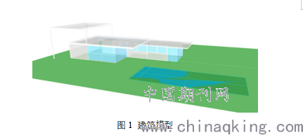 本次模拟建筑为单层建筑,一层主要功能房间为起居室、卧室、厨房、卫生间,二层为公共敞开平台及储藏室等。本次模拟建筑地处于空旷地区,场地周边建筑物较少,场地内设有泳池,考虑水面对日照光的反射影响,本次模拟模型建立范围为建筑物及泳池。
