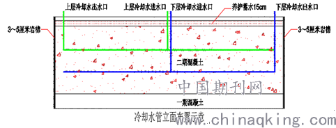 螺旋形冷却钢管通冷水可有效降低内部温度,但应控制内部温度与进水水温之差不超过25℃,否则也会产生内部裂纹、裂缝,根据测温情况,调节水量即可有效控制内部温度。