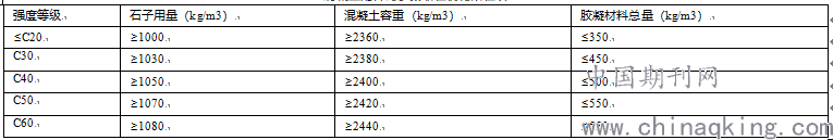 2、配合比质量控制。混凝土配合比的设计质量,直接影响混凝土结构实体的耐久性。若水泥用量大、石子用量少,混凝土容重就会减少,将会导致混凝土实体方量不足。水泥用量大、石子用量少的混凝土用于建筑工程中,将会出现混凝土收缩大、混凝土开裂等质量问题。建议采用中建八局十项新技术中的一项关于混凝土配合比参数取值优化限值,见下表。