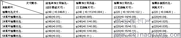 此电站转轮体轴套内孔直接按计算值[工艺控制尺寸φ220(+0.161/+ 0.122)]进行加工控制,轴套采用液氮冷装于转轮体,恢复常温后测量φ220铜套内孔满足图纸φ220(+0.046/0)尺寸要求。