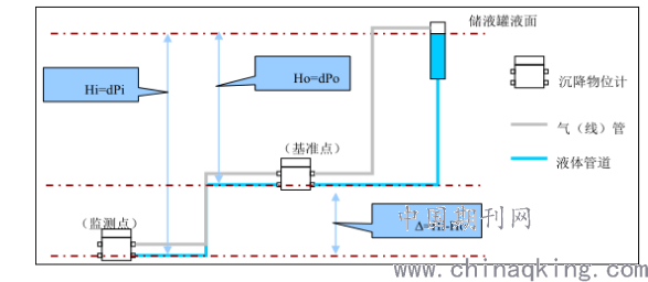 该自动化监测系统开发于液位连接器原理,利用沉降的物位计在不同的监测点测量液面高度,进行监测基准点与各个监测点的相对沉降。物位计则通过液管连接,基准物位计作为稳定参考点,其它物位计则当做是监测点。若以基准点与参考液面的高度差作为Ho,以参考液面与监测点的高差当作Hi,则可得出Ho及Hi的数值,Hi-Ho的值为监测点相对于基准点的高差△。当监测点有垂直位移时,即发生沉降时,测点的液压会发生一定程度的变化,经传感器内的温度补偿器修正后,即可以计算出相对于基准点的高程变化。