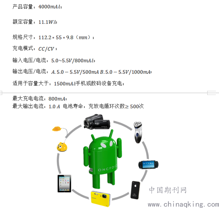 此外,我们还设计了一个存储和收集能量的装置—电能蓄能器。收集回来的能量相当于一个移动电源,可满足手机充电、台灯照明、电动剃须刀、数码相机等,如图5所示。通过计算和查找参考资料,我们设计的蓄能器的规格参数为:
