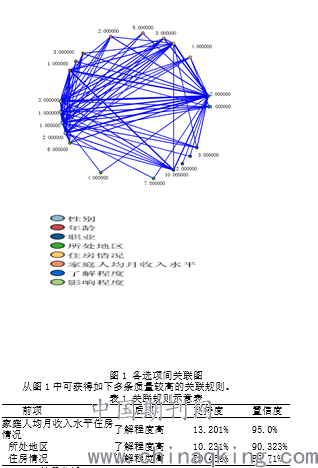 我们将909份有效问卷样本数据整理后,以市民基本信息指标为前项,以杭州市民对政策了解程度和影响程度为后项,设定最小支持度为10%,最小置信度为80%,采用SPSS clementine 12对问卷集中蕴含的关联规则进行挖掘,得到如下选项关联图。其中两点之间连线代表两个选项之间存在着较为明显的关联,且线形越粗关联越显著,即在前问中选择该选项的人更有可能在后一问中选择连线所对应的选项。