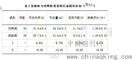 比较两组患者在不同引流方式下的引流情况,实验组患者采用负压引流专业护理措施,患者的引流时间、引流液的量、住院时间以及引流期间的疼痛均显著低于对照组,数据具有统计学价值,P<0.05,如表1所示: