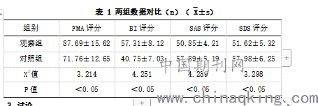 两组患者采用不同护理方法后,统计患者的运动功能评分(FMA)、生活活动能力评分(BI)、抑郁量评分(SAS)和焦虑量评分(SDS),并将结果进行比较。