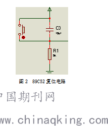 计算机在启动运行时都需要复位,使CPU和其他部件都置为一个确定的初始状态,并从这个状态开始工作。89C52等CMOS 51系列单片机的复位引脚RST是史密特触发输入脚。当晶振起振以后,在RST引脚上输入2个机器周期以上的高电平,器件便进入复位状态,此时,ALE、PSEN、P0、P1、P2、P3输出高电平,RST上输入返回低电平以后,便退出复位状态开始工作。当Vcc的上升时间为10ms,振荡器的频率为12MHz,则复位电路中C的典型值为10μF,R为3~10kΩ。89C52单片机复位电路如图2所示。