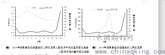 图1 2018年滦南县妇幼保健院幼儿肺炎发病人数与月平均风速的变化曲线 图2 2018年滦南县妇幼保健院幼儿肺炎发病人数与月降水量的变化曲线