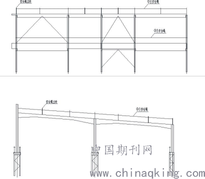 安装托架、屋架梁时,安全绳固定于梁上,经检查确认后方可进行吊装。屋面横向、纵向均设置安全绳。示意图如下: