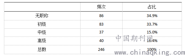 职称往往代表了一个教师掌握基础理论和专业知识的程度,对教学教育能力也有所体现。研究者随机选取了广东省佛山市各级各类幼儿园中在职教师246名,对其进行了职称调查,没有职称教师86人,占34.9%,初级教师83人,占33.7%,中级教师37人,占15.0%,高级教师40人,占16.4%。